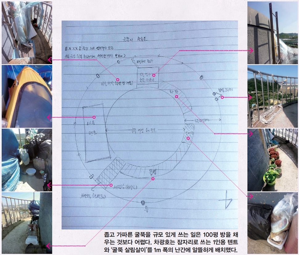 굴뚝 내경을 사이에 두고 텐트 반대쪽엔 쓰레기장이 있다. 쓰레기장 오른편은 텃밭이자 화단이다. 굴뚝에서 빛을 가장 잘 받는 공간이다. 차광호는 콩과 열무, 상추와 수박을 심어 ‘굴뚝 농사’를 짓는다. 상추와 열무는 싹을 쑥쑥 올려 두어 차례 솎아냈다. 땅에서 올려준 비빔국수에 섞어 먹거나, 된장과 고추장을 넣어 비벼 먹는다. 땅의 노동자가 ‘굴뚝 농부’가 돼가고 있다.