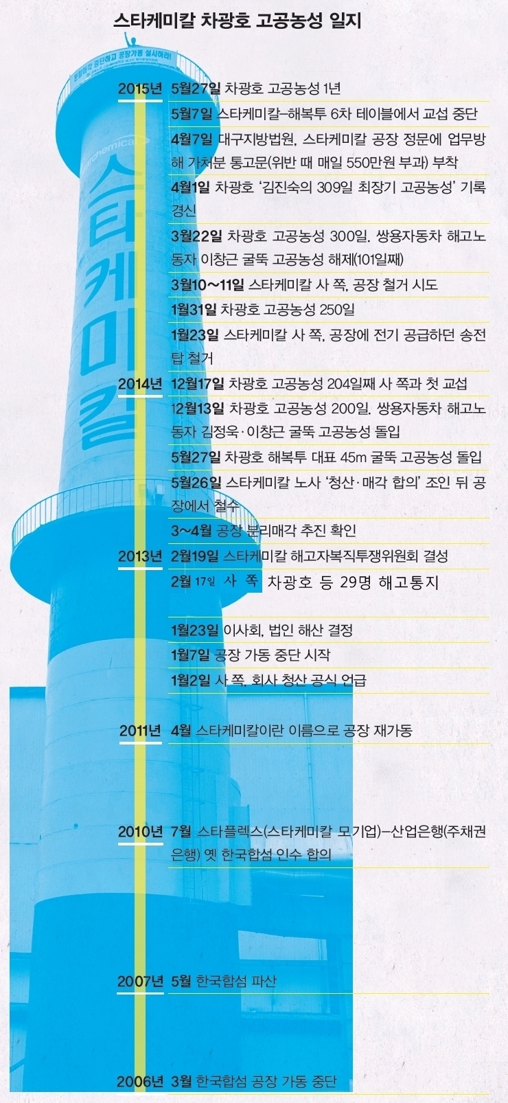 45m 굴뚝 위에서 차광호는 기억과 싸운다. 기계가 멈춘 텅 빈 공장 곳곳에 그와 동료들의 시간이 배어 있다. 공장은 본래 과수원이었다. 과수원 옆은 논이었고 논을 따라 개울이 흘렀다. 2km 거리에 차광호의 고향집이 있었다. 중·고등학생 시절 차광호와 친구들은 과일 향을 맡으며 지금의 굴뚝 아래서 뛰놀았다. 25살 때(1995년) 한국합섬(스타케미칼 전신)이 과수원을 밀고 공장을 세웠다. 서울에서 일하던 차광호는 고향으로 내려와 공장의 노동자가 됐다. 좁고 가파른 굴뚝을 규모 있게 쓰는 일은 100평 방을 채우는 것보다 어렵다. 굴뚝에 오른 첫날 차광호는 긴장 속에 새벽을 보낸 뒤 의식을 잃듯 쓰러져 잤다. 그는 잠에서 깬 자리에 텐트를 쳤다. 작은 1인용 텐트는 추위·더위와 대결하는 그의 최전선 참호다. 텐트를 제외한 공간에 살림이 배분됐다. 텐트 왼쪽 굴뚝 난간엔 비닐을 덮었다. 먹을거리를 두는 부엌이자 볕 좋은 날 하늘을 쪼이는 거실로 쓴다. 부엌·거실의 출입구는 굴뚝에 올라오는 사다리 구멍과 잇닿아 있다. 사다리 구멍 아래에서 1년 동안 밟지 못한 땅이 아득하다. 굴뚝 난간의 넓이는 1m 정도다. 난간 한쪽에 밥을 올리고 내리는 밧줄이 걸려 있다. “최근 아침밥을 먹고 빈 그릇을 내렸는데 굴뚝 중간에서 밧줄이 엉켜버렸다. 아무리 해도 풀리지 않아 20m 지점의 중간 난간까지 내려가 꼬인 줄을 풀었다. 45m의 난간보다 폭이 30~50cm 넓었다. 운동장 같았다. 땅에서 올려다보는 동지들 얼굴도 더 잘 보였다. 조금 더 낮아진다는 것이 그렇게 안도감을 줄지 몰랐다.” 지름 8m의 굴뚝 안엔 지름 6m의 내경이 있다. 굴뚝 내경 꼭대기에 걸쳐진 사다리는 차광호의 운동기구다. 사다리를 철봉 삼아 그는 턱걸이를 한다. 상체 강화운동을 새로 시작했다. 윗몸일으키기와 다리 들어올리기도 운동에 추가했다. 걷기운동 방법을 바꿨다. 굴뚝 둘레를 왕복해 걷되 농성 날짜만큼 횟수를 늘려가는 방식에서, 목표량을 정하고 달성 시간을 단축하는 쪽으로 전환했다. ‘굴뚝 222바퀴 주파’ 시간이 45분에서 현재 35분까지 줄었다. 굴뚝을 1년 동안 돌며 그의 몸을 지탱해준 운동화 뒤꿈치가 굴뚝 난간처럼 둥글게 닳아 밑창을 드러냈다. 1년 새 두 켤레의 신발 밑창이 못쓰게 됐다. 아내한테 새 운동화 사달라는 말을 꺼내지 못했다. ‘4월에 내려간다’는 이야기를 동료한테 듣고 기대했을 아내였다. 한국합섬 가동 중단(2006년) 이후 1년8개월밖에 돈을 벌지 못한 남편 대신 아내는 어린이집을 다니며 가정을 꾸렸다. ‘아직 내려갈 수 없다’고 말하며 차광호는 단어를 잇지 못했었다. 새 운동화는 해복투 동료들이 사서 올렸다. 10명의 동료는 차광호에게 ‘또 다른 자신’이었다. 박성호(전 해복투 대표), 정병옥(정책기획), 고민각(법률), 홍기탁(농성단 대표), 박준호(상황), 김덕원(조직), 손남호(법률), 김옥배(대외협력), 김진원(농성장), 조정기(총무). 막내 김진원(스타케미칼 시절 입사)를 제외한 10명이 한국합섬 때부터 서로의 곁을 지켜왔다. 그들 모두가 생존 위기에 직면해 있다. “대부분 아파트 전세를 담보 잡거나 빚을 낸 돈으로 견딘다. 적금이나 보험은 헐어 쓴 지 오래다. 기혼자의 경우 아내들이 파트타임 아르바이트를 하며 ‘최저생계’를 꾸린다. 전기세·수도세 납부가 밀린 적도 많다.” 홍기탁은 전했다. 아파트가 빚으로 넘어갈 상황에 처한 한 동료는 주간엔 하청업체에서 돈을 벌고 야간엔 농성장에서 잔 뒤 출근한다. 6개월간 지원되던 금속노조의 생계지원비도 지난 2월치를 마지막으로 끊겼다.