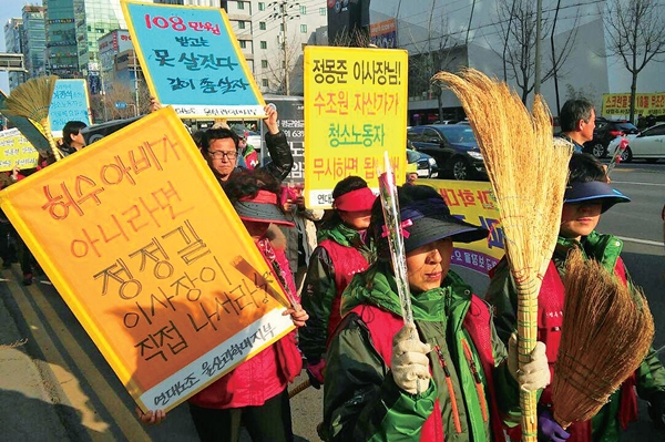 그녀의 고향은 경남 거제도. 고향 사람을 소개받고 부산으로 터전을 옮겼다. 그 뒤 남편과 “별로 미워하는 것 없이” 살았다. 다만 생활이 곤궁했다. 물려받은 재산도 없이 남편은 동생들 키우느라 총각 때 번 돈을 다 썼다. 심성 고운 선이씨는 불만도 없이 내 가정 지킬 생각만 했다. 공장에도 나갔고, 식당에도 나갔다. 이 일 저 일 하다보니 “선이가 시집가서 말이나 하겠느냐” 하던 오빠들의 걱정은 옛말이 되었다. 순둥이 같은 성격이 사라졌다. 오빠만 위로 4명, 언니 하나에 아래로는 남동생 셋. 남자 형제 많은 집에서 오빠들이 ‘시키는 대로’ 홀로 된 어머니를 모시고 집을 지켰다. 결혼하기 전까지 도시에 나가본 적도 별로 없었다. 결혼을 하고 부산도 가고 서울도 갔다. 남편은 ‘노가다’도 하고 배도 탔다. 그러는 사이 아이들 셋이 태어나 엄마에게 올망졸망 매달렸다. 서울 생활 3년째, 수해민이 됐다. 물에 다 떠내려갔다. 세 들어 산 처지라 보상도 제대로 받지 못했다. 체육관에서 며칠 지내고 움막 같은 임시 거처에서 살다가 안 되겠다 싶어 오빠들이 있는 울산으로 내려왔다. 조선소에서 근무하던 오빠들을 따라 남편도 조선소에 취직했다. 애를 키우고, 틈틈이 돈을 버는 생활이 울산에서도 반복됐다. 남편의 벌이가 나아지고, 그래서 같이 번 돈으로 아파트 하나 살 수 있었던 것은 ‘87년’ 때문이었다. 현대 계열 회사의 노동자들이 주도적으로 노동조합을 만들었다. 87년 노동자대투쟁의 중심지였던 울산. “무서웠지. 눈도 코도 못 뜨고, 따가워서. 남자들은 맞기도 많이 맞았지. 시위에 나간 사람들이 최루탄에 눈을 못 뜨면 우리가 다라(대야)에 물 떠다가 주고 그랬지. 그때는 다 하니까. 그랬기 때문에 아무래도 임금이나 이런 게 좀 나아졌지. 우리 역시 마찬가지잖아. 2007년에 파업을 했기 때문에 지금껏 있지. 안 그러면 다 쫓겨났지.” “아침저녁 문안인사 못한다 했어” 2007년은 울산과학대 청소노동자들이 노동조합을 만든 해다. 친한 친구가 울산과학대에서 같이 일하자고 했다. 와보니 엉망이었다. 그녀의 표현대로라면 “공산주의도 그런 공산주의가 없었다”. 반장인 경비에게 출퇴근 때마다 인사하러 가야 했다. 사람들은 그것을 ‘문안인사’라 불렀다. 때마다 떡값, 회식비를 모아줘야 하는 윗사람이 많았다. 청소노동자는 11명인데 담당 교직원까지 합치면 관리직만 6명이었다. 다들 문안인사를 받으려 했고, 뭐라도 얻어먹으려 했다. “나는 못한다 했어. 당당하게 내 일만 잘하면 되지. 경비 아저씨 그런 사람에게 아침저녁 문안인사 못한다고 했지.” 한바탕 난리가 났다. 매번 싸우고 억울해하는 가운데, 지금 울산과학대 지부장인 김순자씨가 들어왔다. “순자 언니가 활발하잖아. 튄다고 미움이 간 거야. 언니가 넘 서럽지. 나도 그땐 친하지 않았어. 그래도 지부장 언니보고 ‘언니야 더러운 게 돈인데, 참고 견디면 좋은 날이 오겠지. 참읍시다’ 하며 그렇게 왔지. 그래가지고 오다가 보니, 이 선까지 왔네.” 파업 1년까지 왔다. 착한 남자 만나 산 38년처럼, 지난 1년도 후딱 지나갔다고 한다. 정신없이 시간만 갔다. 최근 농성장 처지가 달라지긴 했다. 먹거리가 풍부하던 농성장이 철거됐다. 임시 천막을 세우고 라면으로 연명한다. 끼니나 해결할까 해서 왔던 조선소 하청노동자들은 이제 밥도 못 주는데 농성장을 떠나지 못한다. 오히려 대학이 고용한 젊은 경비들에 의해 나이 든 몸이 다쳤다. 뼈가 부러지고 인대가 늘어났다. 못 떠나는 이유를 물으니 연민, 의리, 흔한 감정들이 대답으로 나온다. 그런 감정들 때문에 조선소 하청노동자 김영배(52)씨도 갈비뼈가 부러졌다. 영배씨의 삶을 바꾼 것은 1987년. 선이씨가 말한 무섭던 때였다. 그는 20대 청춘이었다. 도시로 와 일하는 부모 대신 어린 동생을 돌봤다. 똑똑했으나 공부에 흥미를 느낄 새가 없었다. 고등학교를 가니 실습비 명목으로 번번이 돈을 요구했다. 학교를 포기하고 돈을 벌러 집을 떠났다. 경북 포항에서 시작한 첫 직장은 엉망이었다. 화장실만 가도 ‘조인트’를 까고 쥐어박고 체벌을 했다. “잘못된 걸 아는 게 힘든 거예요”