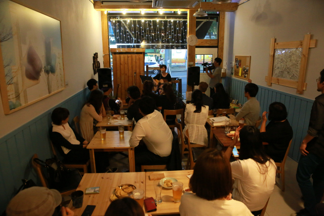 ‘우동사’ 멤버 20명은 빌라 3채에서 같이 사는 식구다. 이들이 운영하는 ‘커뮤니티 펍 0.4㎞’에서 지난 5월30일 동네 주민들과 함께하는 ‘소박한 음악회’가 열렸다.