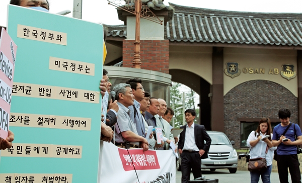 평택사회경제발전소 등 시민단체 회원들이 지난 6월1일 경기도 평택 주한미군 오산 공군기지 앞에서 기자회견을 열어 탄저균 반입 사건에 대한 진상 규명을 촉구하고 있다. 연합뉴스