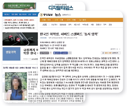 천재 수학소녀 성공기’가 일주일 만에 ‘실패기’로 전락했다. 미국 토머스제퍼슨과학고 3학년 김정윤양이 스탠퍼드와 하버드에서 동시입학을 제안받았다는 소식에 한국 언론은 ‘당연하게도’ 열렬히 반응했다. 보도 뒤 미국 현지 커뮤니티 등을 중심으로 조작 의혹이 일었고, ‘입학 허가 사실 무근’이란 두 학교의 확인으로 상황은 반전했다. 학력사회의 플레이어로 뛰어온 언론의 치부도 재확인됐다. <미주중앙일보>의 첫 보도는 진학 컨설턴트로 일하는 객원기자가 썼고, 김양의 아버지는 현넥슨 전무이자 전 <중앙일보> 워싱턴 특파원이다. ‘스토리’는 그 맥락 속에서 탄생했다. 아버지 김정욱씨는 6월11일 미국 주재 특파원단에 사과문을 보내 “제가 아이의 아픔을 부추기고 더 크게 만든 점을 마음속으로 깊이 반성한다. 가족 모두 아이를 잘 치료하고 돌보는 데 전력하면서 조용히 살아가겠다”고 밝혔다.