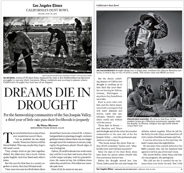 지난 4월20일, 14개 언론 분야와 7개 비언론 분야의 2015년 퓰리처상 수상작이 발표됐다. 그 가운데 피처라이팅 부문 수상작은 <로스앤젤레스타임스>(이하 )의 다이애나 마컴 기자가 쓴 ‘캘리포니아의 모래 지대’(California’s Dust Bowl)였다.