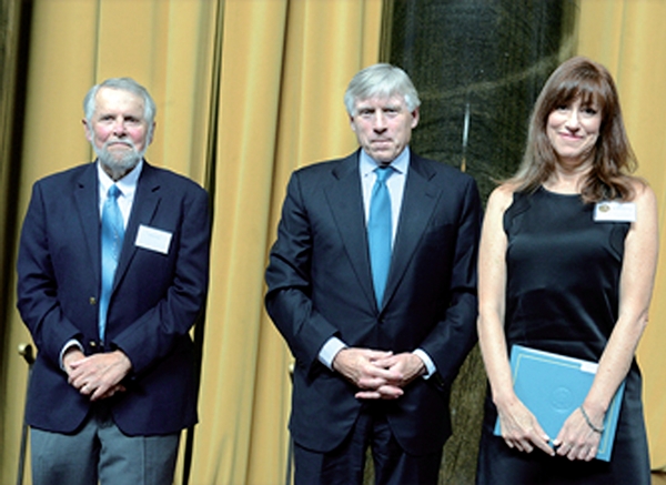 지난 5월28일 미국 컬럼비아대 도서관에서 열린 ‘2015 퓰리처상’ 시상식에서 마이크 프라이드 퓰리처상 심사위원회 사무국장, 리 볼링어 컬럼비아대 총장, 다이애나 마컴 기자가 사진 촬영을 하고 있다(왼쪽부터). The Pulitzer Prize
