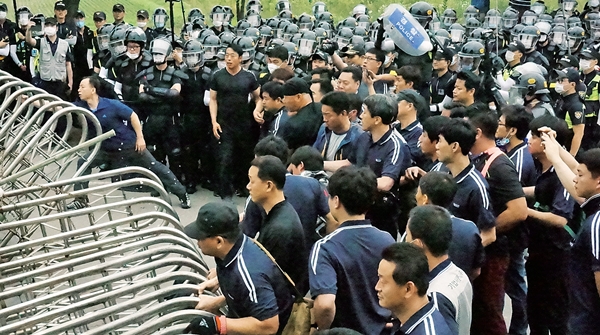 갑을오토텍 노동자들은 지난 6월18일부터 엿새 동안 매일 ‘전쟁’을 치렀습니다. 회사 안에서 농성 중인 금속노조 갑을오토텍지회 조합원들과 회사로 들어오려는 또 다른 노조인 ‘기업노조’ 조합원들이 경찰을 사이에 두고 물리적 충돌을 반복했기 때문입니다.