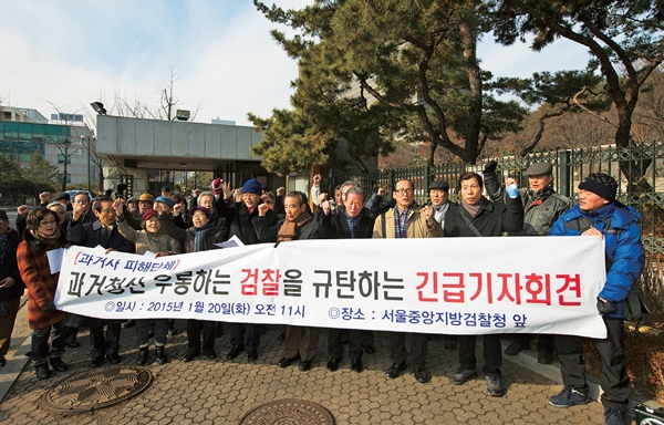 국가폭력 피해자들이 지난 1월20일 서울 서초동 서울중앙지방법원 앞에서 기자회견을 열어 과거사위 위원회에 참여했던 ‘민주사회를 위한 변호사모임’ 변호사를 상대로 표적수사 하는 검찰을 규탄하고 있다. 한겨레 김성광 기자