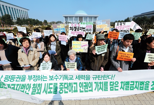 국내에서도 차별금지법안의 입법 움직임은 있었으나 보수계의 반발에 좌절됐다. 2013년 4월 국회가 차별금지법안을 철회하자 이에 항의하는 차별금지법안 찬성론자들의 모습. 한겨레 김정효 기자