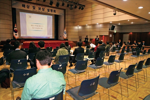 해양수산부가 세월호 참사 희생자 가족과 피해자를 상대로 한 배상 및 보상 신청 접수에 박차를 가하고 있다. 지난 4월10일 서울 송파구 수협중앙회 대강당에서 열린 세월호 참사 배·보상 관련 해양수산부 설명회. 류우종 기자