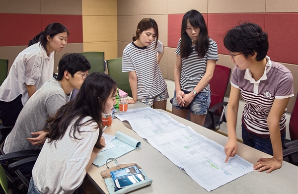 7월14일 오전 회의실에서 정은주 기자(맨 오른쪽)가 교육연수생 5명과 세월호 보도 뒷이야기를 나눴다. 정은주 기자 왼쪽부터 교육연수생 홍연, 이선민, 이지민, 강남규, 김가윤씨. 박승화 기자