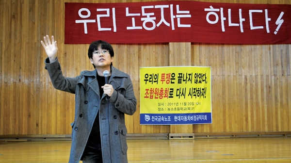 2011년 11월 정기호 변호사가 비정규직 노동자들에게 법률교육을 하고 있다. 정 변호사는 노동자를 변호하고 법률자문을 하는 데 그치지 않고 노동자들의 동료이자 동지 노릇도 했다. 최근에는 투쟁으로 해고된 노동자들에게 생계비 등을 지원하는 울산지역연대기금 대표라는 감투를 썼다. 배문석 제공