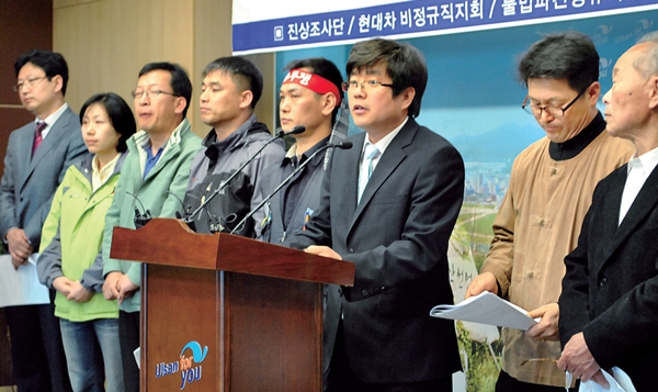 현대자동차 비정규직지회 노동조합 탄압 규탄 기자회견에 참석해 법률적 문제를 설명하고 있는 정기호 변호사. 배문석 제공