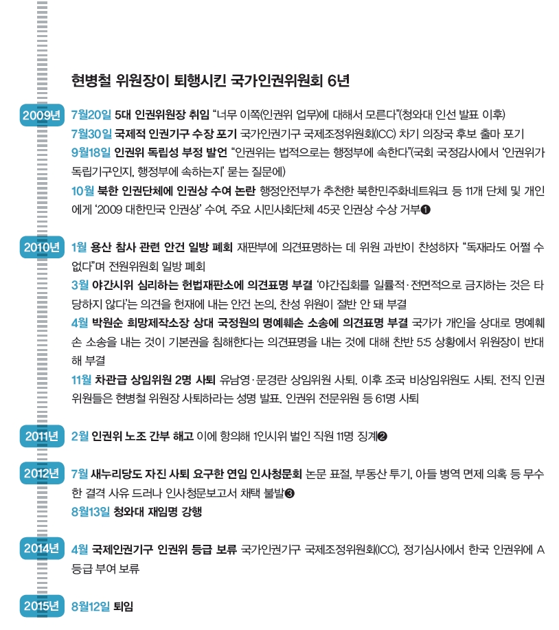인권 의제가 약자와 소수자의 권리를 보호하는 본래적 의미와 상관없이 권력 집단의 곤경을 모면하는 변명거리로 오염된 것 역시 현병철 체제의 과오다. 현 위원장은 인권에 대한 해괴한 해석으로 조롱당한 일이 많았다. 2010년 11월 취임 1년 만에 상임위원을 비롯한 인권위원들이 대거 사퇴하면서 용퇴 위기에 몰렸을 때 발표한 성명이 대표적이다. 그는 성명에서 ‘위원회의 독립성은 정부뿐 아니라 어떠한 외부의 힘으로부터도 독립되어야’ 한다는 소신을 밝혔는데, 여기서 ‘외부’란 그의 자질을 문제 삼는 비판세력을 지칭한 것이었다. ‘독립성’을 자신에게 유리한 쪽으로만 이용한 것이다.