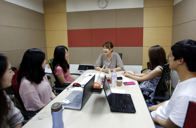 7월21일 저녁 <한겨레21> 회의실에서 임지선 기자(중앙)가 교육연수생 5명과 아동학대 사망 보도 뒷이야기를 나눴다. 정용일 기자