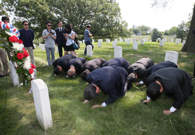 03 김무성 새누리당 대표가 큰절을 했다. 주미 재향군인회 회원들에게, 초대 미8군 사령관 묘지 앞에서도. “새누리당이 진보 좌파가 준동 못하도록 노력하겠다” “(미 의회 지도자들에게) 우리는 중국보다 미국이라는 확실한 메시지를 전달할 것”이라고도 했다. 들린다, 바가지 물 새는 소리.