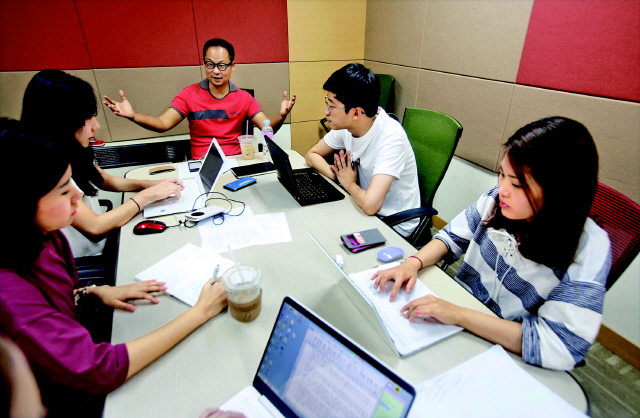 7월28일 오후 <한겨레21> 회의실에서 신윤동욱 기자(가운데)가 교육연수생 5명과 취재 뒷이야기를 나누고 있다. 정용일 기자