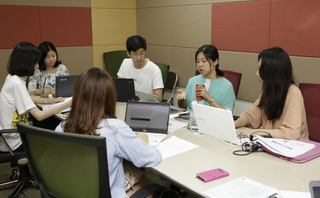 8월4일 오후 <한겨레21> 회의실에서 황예랑 기자(오른쪽 두 번째)가 교육연수생 5명과 취재 뒷이야기를 나누고 있다. 김진수 기자