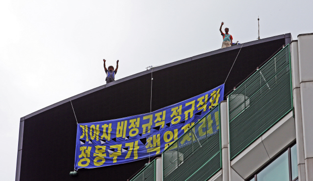지난해 9월 1심 재판부는 기아차 사내하청 노동자들의 불법파견 사실을 인정했다. 사 쪽은 항소했고 정규직 노동자가 다수인 금속노조 기아차지부와 ‘465명 신규채용’ 방식에 합의했다. 두 노동자는 ‘모든 사내하청 노동자의 정규직화’를 요구하며 지난 6월11일 광고탑 농성을 시작했다.