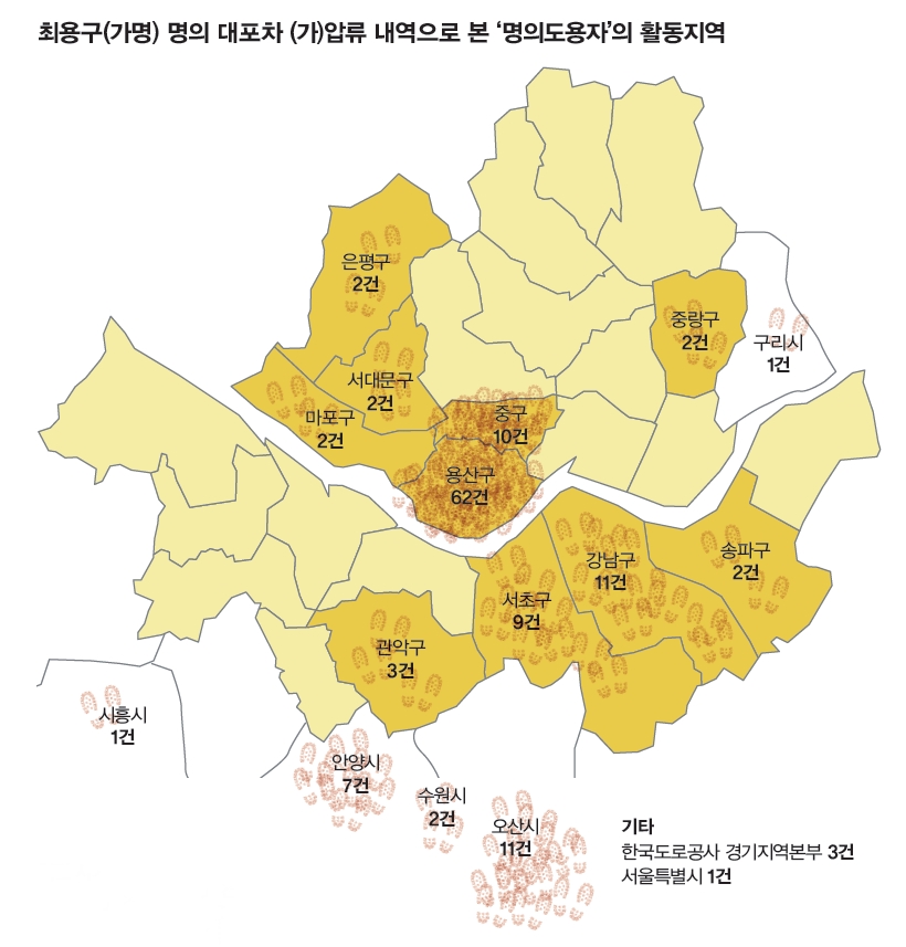 ‘왕숙천 그놈’은 차량 방치 7개월 전 구리시에서 주정차 위반 딱지를 끊었다. 2011년 1월10일 구리시는 과태료 체납으로 차를 압류했다. 과태료 부과와 압류 사실은 최용구 앞으로 통보됐다. 그놈(들)이 돌아가며 사용한 대포차를 전국의 지자체·경찰·법원·기관들은 14년 동안 132차례 압류했다. 그놈(들)이 새 차를 뽑은 지 5개월 뒤부터 압류 기록들(하단 인포그래픽 참조)이 최용구의 이름 위에 탑처럼 쌓이기 시작했다.