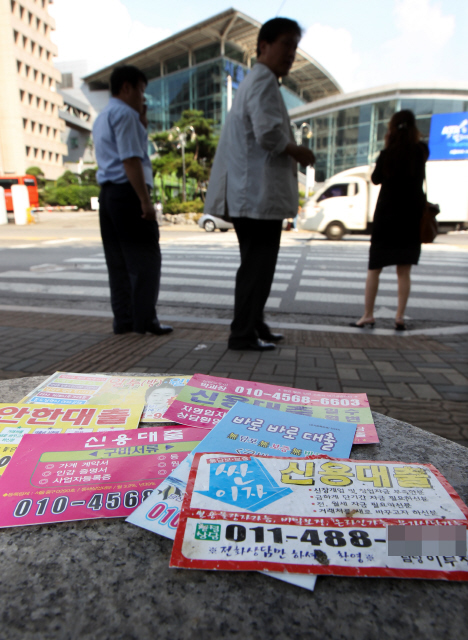 신용대출을 권하는 대부업체들의 광고 전단지가 서울 시내 인도 위에 뿌려져 있다.