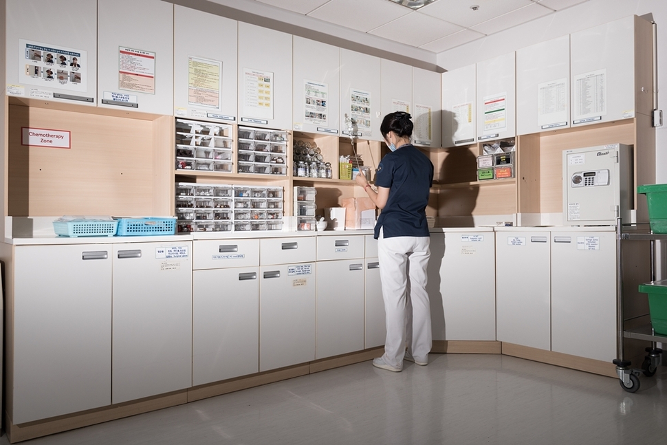 이달에만 다섯 번째 임종이다. 5년째 하고 있는 일인데도 좀처럼 익숙해지지 않는다. 잠시 할머니를 떠올리다 이내 정신을 차린다. 처방전에 따라 카트에 주사기와 약을 챙겨 병실을 돌아야 한다. 아티반, 메리톨, 옥티넘, 황몰핀…. 말기암 환자의 고통을 줄여주는 마약들이다. 100가지도 넘는 약이 담겨 있는 서랍에서 약을 빼내는 손놀림이 재빠르다. 병실을 돈다. 한 환자가 밤새 고통스러웠는지 손으로 피아이시시(PICC·팔에서 좌심방까지 연결된 50cm 길이의 튜브)를 ‘3시엠(cm)’가량 뽑았다. 의사에게 보고하고 인턴과 함께 튜브를 제거했다.
