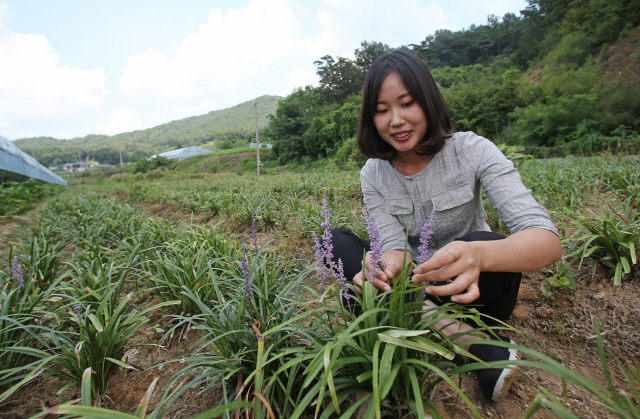 충남 청양군에서 김치공장 ‘미녀와 김치’를 세운 29살 농부이자 사업가인 윤지영씨. 그가 매만지고 있는 것은 김치 재료로도 쓰이는 지역 특산품 맥문동이다. 김진수 기자