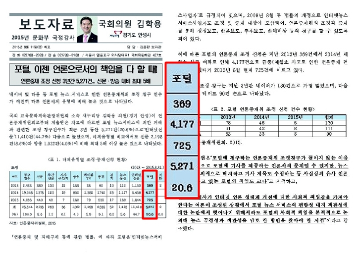 분류 왜곡 통한 통계 왜곡 김학용 의원의 ‘이상한 분석’은 지난 9월11일에도 있었다. 포털을 상대로 언론중재위원회에 접수된 조정 청구 건수를 데이터로 택했다. 최근 3년간 쌓인 전체 청구 2만5544건 중 포털 대상은 5271건(20.6%)이라고 발표했다. ‘신문 2198건(8.6%)과 방송 1022건(4.0%)보다 최대 5배 이상 많다’는 강조가 따랐다.