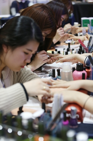 지난 4월23일 열린 ‘헬스 앤 뷰티위크’(서울 강남구 삼성동 코엑스)에서 네일 아티스트들이 행사 참가자들에게 네일 케어를 해주고 있다. 연합뉴스