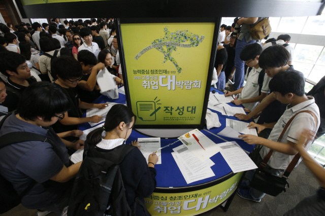 지난 9월4일 ‘능력중심 창조인재를 위한 2015 고졸성공 취업 대박람회’가 열린 서울 강남구 삼성동 코엑스에서 교복을 입은 고등학생들이 행사 참가를 위한 등록카드를 작성하고 있다. 한겨레 이정아 기자