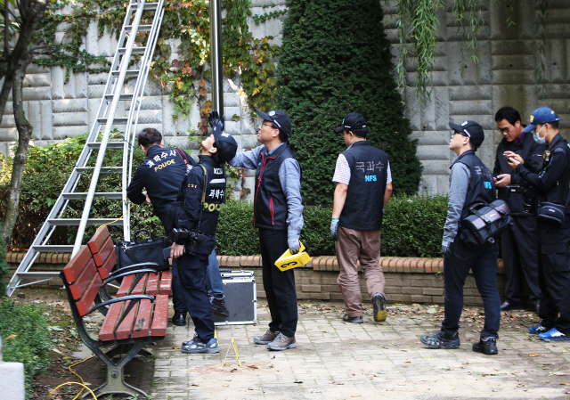 10월14일 경기도 용인 캣맘 사건 현장에서 국립과학수사연구원 관계자들이 벽돌 투척 지점 예상을 위한 3차원 스캐너 이용 시뮬레이션 실험을 위한 측정을 하고 있다. 연합뉴스