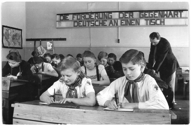 독일 분단 시절 동독 초등학교 교실의 모습. 동독의 역사 교과서는 나치 시기의 역사 교과서와 함께 국정교과서를 통한 파국적 역사교육의 전범이었다. 독일역사박물관 홈페이지 갈무리
