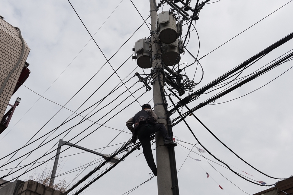 빨강·주황·회색이 어우러진 잠바, 잘 다려 ‘각’ 잡힌 바지를 입은 SK브로드밴드 이영한(41) 기사가 공구 가방을 어깨에 걸친다. 오른손에 동축케이블, 왼손에 랜선을 들고 계단을 오른다. 방 두 개짜리 작은 빌라다. 창문 밖으로 동축케이블을 던진다. 뛰어내려가 동그랗게 만 케이블을 어깨에 걸고 6m 통신주(통신선을 연결하기 위해 KT가 설치한 작은 전신주)에 오른다. 케이블을 연결하고 표지를 붙인다. 통신주에서 나온 50여 개의 선이 거미줄처럼 펼쳐져 있다.