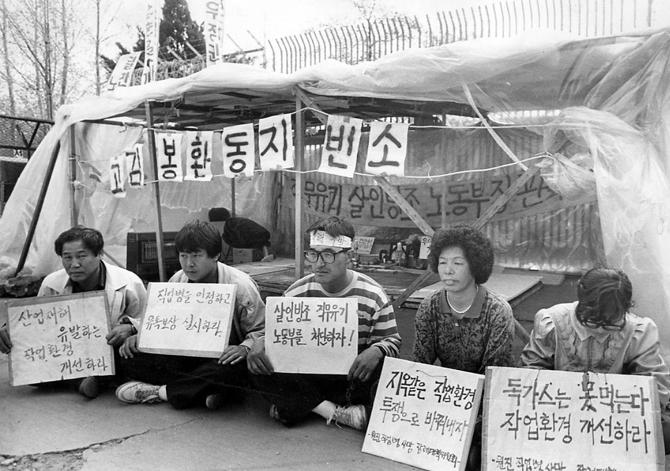 1991년 이황화탄소 중독자로 판명된 원진레이온 노동자들이 회사 앞 고 김봉환씨의 빈소에서 111일째 직업병 인정을 요구하며 침묵농성을 벌이고 있다. 한겨레