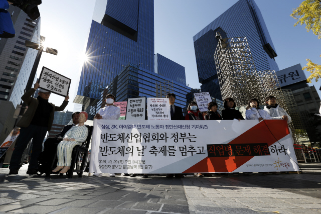 삼성전자 반도체 공장의 직업병 피해자와 유족, ‘반도체 노동자의 건강과 인권 지킴이, 반올림’ 활동가 등이 ‘반도체의 날’인 지난 10월29일 서울 서초구 삼성전자 본사 앞에서 집단 산재를 신청하겠다는 기자회견을 열었다. 한겨레 김명진 기자