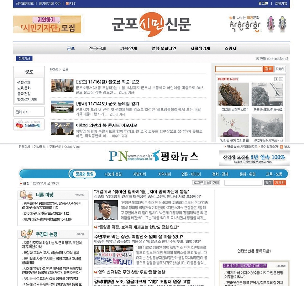 정부 방안대로 인터넷신문 등록요건이 강화되면, 평화뉴스·군포시민신문 등 1~4명으로 운영되는 소규모 인터넷언론은 단숨에 ‘미등록 언론’이 된다. 지역에서 열성적으로 활동하는 매체들이 사라질지도 모른다. 군포시민신문 화면 갈무리, 평화뉴스 화면 갈무리