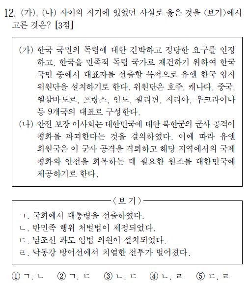 또 (나) 보기 가운데 “안전보장이사회는 대한민국에 대한 북한군의 군사공격이 평화를 파괴한다는 것을 결의하였다”로 설명돼있다. 북한군의 군사공격으로 시작된 남침이라는 것을 명확히 표현하고 있다. 현재 역사교과서를 공부한 학생들이라면 이를 정확히 알고 풀수 있게 만들었다. 역사교과서가 문제 없다는 이야기다.