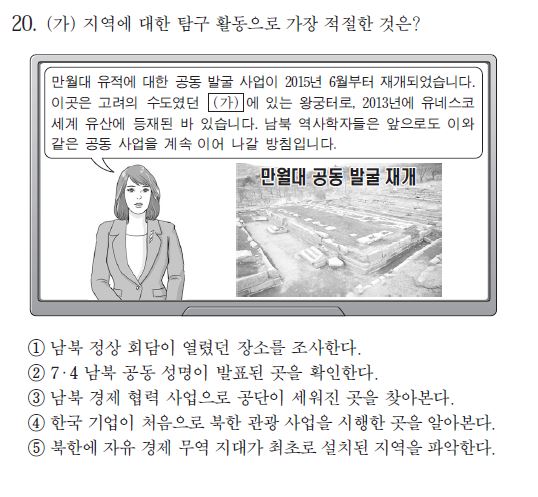 해설 : 개성 지역에 관한 문제다. 지난 2015학년도 시험에는 없었던 통일·북한 문제가 나왔다. 아쉬움은 있다. 이전에는 남북이 통일과 화해를 위해 노력한 사건 위주로 문제가 나왔다면 이번에는 개성공단이 출제됐다. 최근 북한과의 경제협력을 보는 시각은 ’통일은 대박’이라는 인식에 치우쳐 있다.