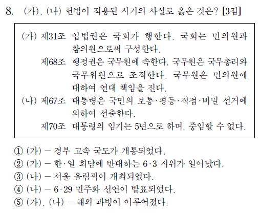 해설 : 1979년의 상황을 묻는 문제다. 10.26사건으로 박정희 대통령이 숨진 뒤 최규하 대통령이 통일주체 국민회의에서 대통령으로 선출됐다. 이후 전두환 등 신군부 세력이 쿠데타를 일으켜 정권을 탈취했다. “일부 군인들이 대통령의 재가도 없이 상관인 육군 참모 총장을 연행하고 군사권을 장악했다는군”으로 표현된 상황이다. 험난한 시대 상황에 대한 설명이지만 보기는 경제 상황에만 집중되어 있다. 역사를 가르치는 심용환 강사는 “예전에는 잘 물어보지 않던 경제개발5개년 계획이 보기로 나왔다. 학교에서 요즘 무엇을 가르치고 있는지 보여주는 것“이라고 설명했다. 경제 상황 뿐만 아니라 이전에 균형있게 등장한 노동 관련 사건이나 민주화운동 관련 보기는 사라졌다.