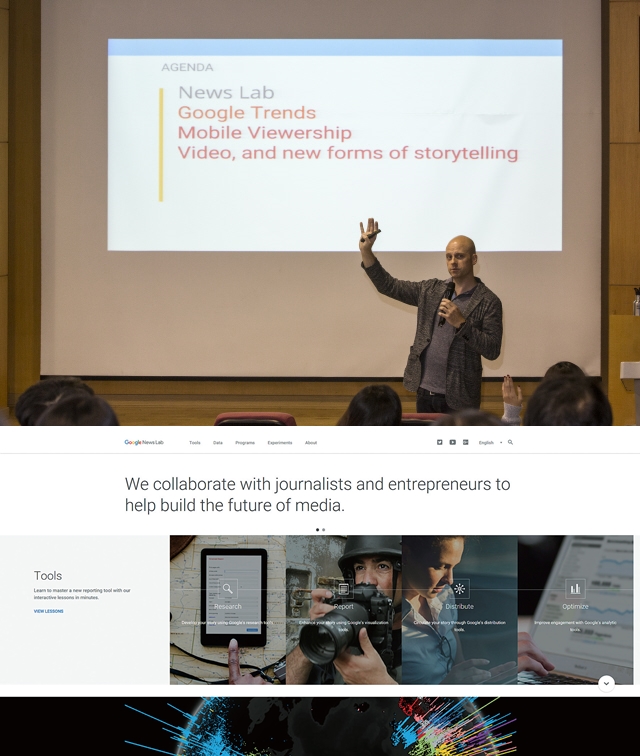 https://newslab.withgoogle.com)은 ‘조사-보도-배포-최적화’로 이어지는 언론 활동 전반의 경로를 제시하고, 궁극적으론 미디어 산업 전반을 ‘안내’하리라는 야심찬 목표를 현실화하려는 집단이다.