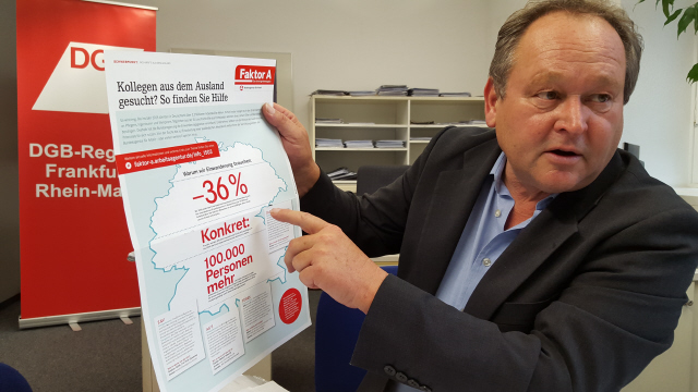 하랄트 피들러 독일노동총동맹 프랑크푸르트지부장(왼쪽)이 독일이 ‘저출산·고령화’로 2025년까지 350만명 정도 노동력이 부족해져, 중동에서 온 난민을 받아들여야 한다고 말하고 있다.