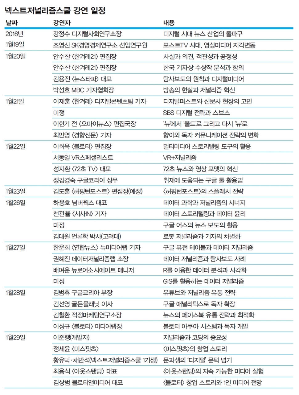 넥스트저널리즘스쿨은 디지털 시대가 요구하는 새로운 기자를 키우는 것에 목표를 둔다. 현재 언론사의 기자 채용 시스템은 미디어 시장의 급변에도 아랑곳하지 않고 30~40년 전 그대로다. 입사 뒤 기자들이 받는 교육도 기존 방식에서 벗어나지 않는다. 방을 가득 채울 만큼 컸던 컴퓨터에서 손안에 들어오는 스마트폰 시대로 세상이 바뀌었지만, 언론사는 여전히 큰 컴퓨터를 끌어안고 사는 곰과 같은 존재다. 아직도 ‘다음 세대’(넥스트) ‘기자’(저널리즘)를 어떻게 ‘교육’(스쿨)할지 헤매고 있다. 물론 변화의 움직임도 보인다. 신문·방송 등 언론사들도 변화된 미디어 환경에서 생존하기 위해 새로운 세대의 디지털 저널리스트 채용을 모색하고 있다. 이미 미국·유럽 등의 발 빠른 언론사들은 기자만큼 개발자를 채용하는 데 눈을 돌리고 있다. 넥스트저널리즘스쿨은 이런 변화된 상황에 맞춰 프로그램을 짰다. 디지털 저널리스트를 꿈꾸는 학생들의 욕구와 새로운 인재를 찾는 언론사의 수요를 충족하는 것에 초점을 뒀다. 데이터·영상… 달라진 뉴스 문법 배워 프로그램은 학생들이 먼저 디지털 시대의 미디어 변화에 대해 살펴보고 저널리즘의 원칙과 윤리, 탐사보도 등을 배울 수 있게 구성됐다. 전통 언론사들의 혁신 움직임도 함께 공부한 뒤 본격적으로 혁신적인 저널리즘 접근법을 배운다. 데이터 저널리즘, 가상현실(VR) 저널리즘, 영상 저널리즘 등이다. 미디어 업계의 현업에서 이 길을 개척하는 전문가들이 나와 강연해 실전과 같은 교육을 하게 된다. 디지털 기기로 뉴스를 소비하는 독자를 위해 달라진 문법으로 뉴스를 제작하는 다양한 기술도 교육할 예정이다. 디지털 미디어 창업을 준비하는 학생들을 위한 수업도 마련됐다. 참여하는 학생들은 팀을 구성해 강의와 과제를 함께 수행한다. 디지털 저널리즘의 기본을 배우면서 실전 경험까지 하게 된다. 학생들은 마지막 최종 발표까지 완수해야 전체 프로그램을 이수한 수료증을 받는다. 최종 발표까지 마친 뒤 최고 점수를 받은 학생 3명은 <블로터>와 <한겨레21>에서 인턴 기회를 받으며, 최우수 학생 2명은 미국 구글 본사를 방문해 취재할 기회도 얻는다. 이번 넥스트저널리즘스쿨은 구글코리아와 <블로터>, 그리고 <한겨레21>이 교육비 전액을 후원하는 프로그램이다. 단 수강생들의 적극적인 학습 참여를 독려하기 위해 최소한의 기본 수강료(10만원)를 받는다. 수강료에는 점심식사·교재·교구 비용 등이 포함된다. 2기 프로그램에 참여하려면 <블로터> 홈페이지(www.bloter.net/archives/245068)에 들어가 지원서를 작성해야 한다. ‘디지털 저널리스트를 꿈꾸는 이유’라는 제목으로 에세이(형식 자유)도 함께 제출해야 한다. 에세이는 전자우편(bloter@bloter.net)으로 접수한다. 모집 대상은 ‘디지털 저널리스트를 꿈꾸는 대학(원)생’ ‘언론사 입사를 준비하는 취업준비생’ ‘뉴스 미디어 창업에 도전하고픈 학생’ 등이다. 12월17일까지 지원서를 접수한다. 합격자는 크리스마스이브인 12월24일 홈페이지에 공지하며 개별 통보도 한다. 많은 젊은이들의 도전을 기다린다.