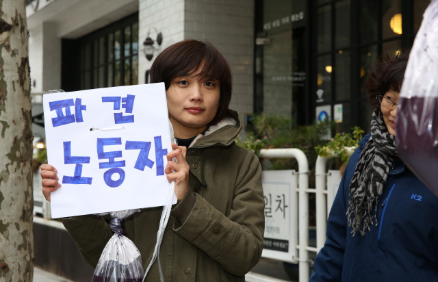 이영숙씨가 지난 11월26일 서울 강남 ㅅ제약 본사 앞에서 ‘파견노동자’라고 쓰인 팻말을 들었다. 영숙씨는 ‘불법파견’으로 자신을 고용했다가 해고한 ㅅ제약을 상대로 ‘직접고용’을 요구하며 싸우고 있다. 류우종 기자
