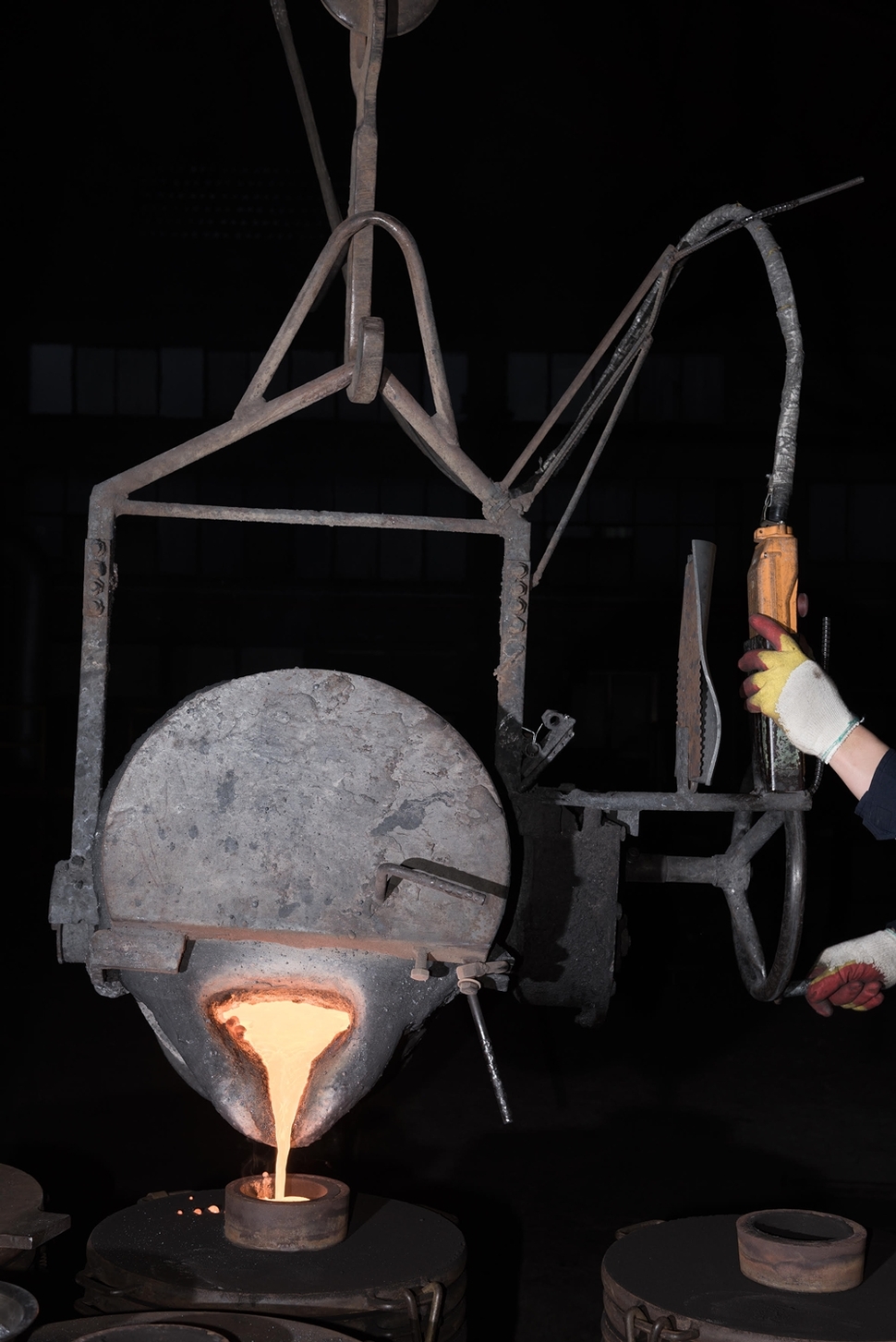 전기로 뚜껑이 열린다. 전기로가 비스듬히 기울어 ‘래들’이라고 불리는 쇳물 양동이에 쇳물을 쏟아낸다. 끓는 쇳물을 담은 래들 손잡이를 천장 크레인에 연결한다. 하늘에 매달린 래들이 줄 맞춰 쌓여 있는 거푸집으로 향한다. 자동차 엔진의 핵심 부품 피스톤링을 만드는 조형틀이 하나씩 반듯하게 올려져 20단을 이루었다. 조형틀 위에 주입컵이 올려져 있다. 허리를 살짝 숙여 래들의 핸들을 천천히 돌린다. 붕어빵 반죽을 붓는 주전자처럼 래들을 살며시 기울여 쇳물을 주입컵에 붓는다. 붉은 쇳물이 거푸집 위에서 출렁거리며 하얀 연기를 피운다. 다음 조형틀로 래들을 옮긴다.