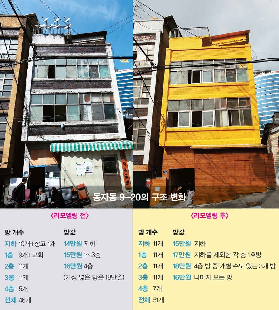 박수광은 재입주 공고 하루 만에 9-20으로 짐을 옮겼다. 9-*의 방값(21만원)은 9-20에 살 때(15만원)보다 6만원 더 비쌌다. 고장 난 다리는 계단을 오르는 그의 체중을 이기지 못했다. 그는 9-* 3층에서 9-20 1층(보수공사 뒤 16만원)으로 방값 5만원과 고도 2개층을 낮춰 이사했다. “1층에서 이 방이 가장 좁아. 아직 이삿짐도 못 풀고 있어.”(이사 이튿날 인터뷰) 짐 박스가 모두 차지한 방에서 짐짝처럼 누운 그가 말했다.