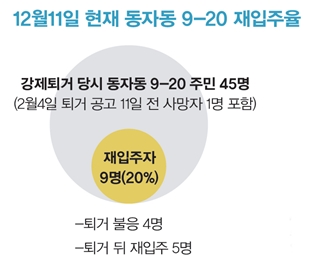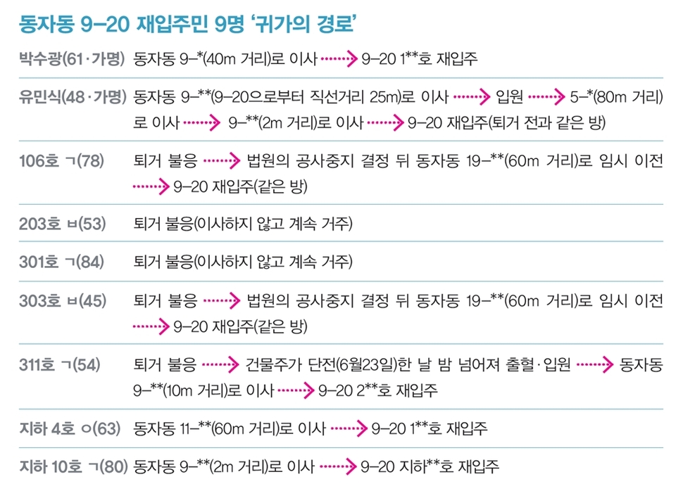 11월10일 박수광은 동자동 9-20 1**호로 돌아왔다. 지난 6월 말 방을 뺀 뒤 5개월여 만이었다. 그는 끝까지 퇴거에 응하지 않은 주민들(4명)을 빼면 가장 먼저 귀가한 강제퇴거자였다. 그가 9-20에서 나와 이사한 곳은 직선거리 40m 떨어진 9-*이었다. 지하 5호 ㅅ(80)과 208호 ㅇ(60), 305호 ㅈ(69)이 서로의 경로를 의식하지 못한 채 같은 번지로 스미었다.