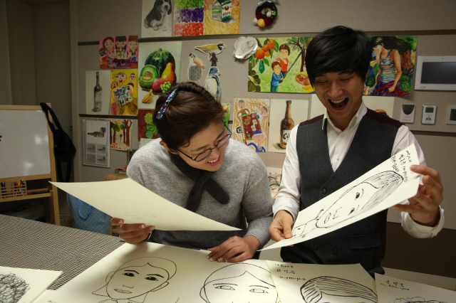 ‘때깔’ 대표 황선미씨(왼쪽)와 남편 장원석씨가 충남 홍성 농촌 마을 주민들이 그린 캐리커처를 보며 이야기하고 있다. 류우종 기자
