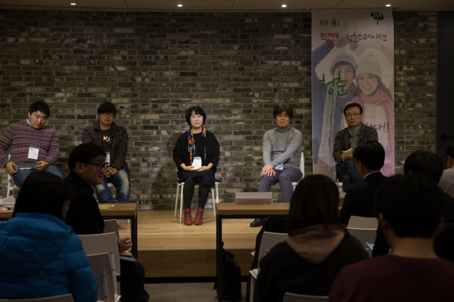 12월16일 서울 홍익대 입구 미디어카페 ‘후’에서 열린 ‘제1회 한겨레청춘포럼’에서 임경수 한겨레 경제사회연구원 초빙연구위원(맨 오른쪽) 등 참석자들이 청중과 의견을 나누고 있다. 김진수 기자