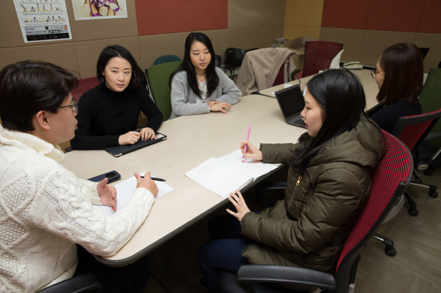 2015년 12월17일 오후 <한겨레21> 회의실에서 2기 교육연수 프로그램의 평가 좌담이 열렸다. 사진 맨 왼쪽부터 안수찬 편집장, 2기 교육연수생 김재희·박로명·이은주, 김효실 기자(왼쪽 사진). 김진수 기자