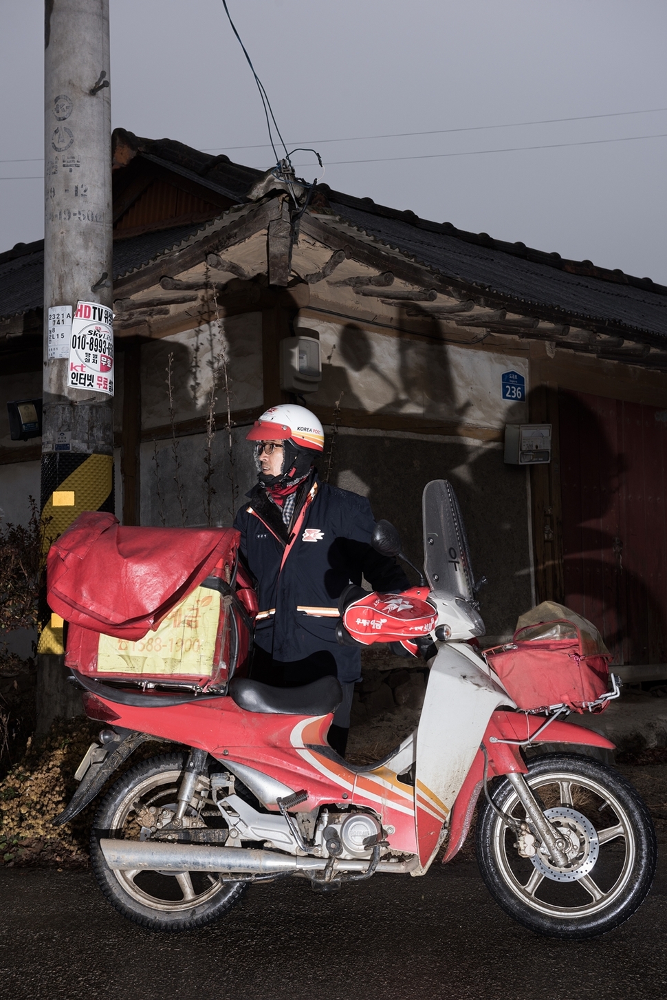 빨간 오토바이는 세 개의 가방을 싣고 달린다. 뒷좌석 붉은 적재함엔 택배와 편지, 등기우편물이 가득하다. 앞바퀴 위에 장착된 바구니엔 곧 배달할 우편물을 놓아둔다. 오토바이에서 내리지 않고 손을 뻗어 우편물을 꺼내기 위해 모종판을 깔아 바닥을 높였다. 집배원을 상징하는 낡은 황토색 가방은 적재함 옆에 묶여 지나간 세월을 말없이 증언한다. 120년 전인 1895년 최초로 등장한 우체부가 건넨 편지엔 무슨 사연이 실렸을까?