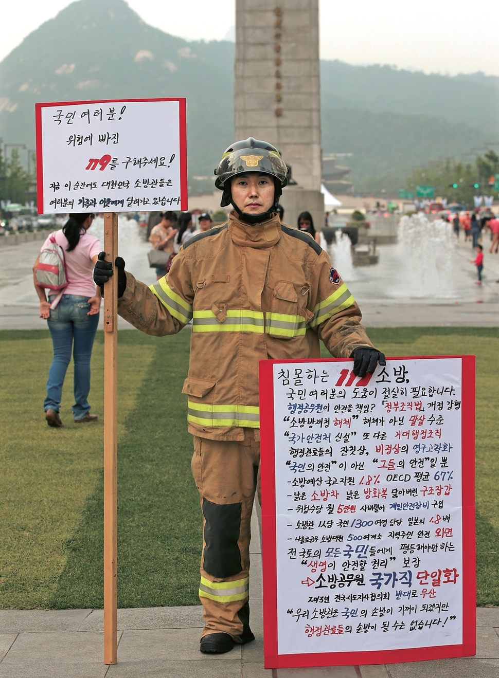 소방관들이 2015년 6월 ‘소방공무원 국가직 전환’을 요구하며 서울 광화문 광장에서 1인시위를 벌이고 있다. 일반 노동자의 근무환경은 산업안전보건법으로 보장받지만, 소방공무원의 근무환경에 대한 규제는 실제 존재하지 않는 것이나 다름없다. 정용일 기자