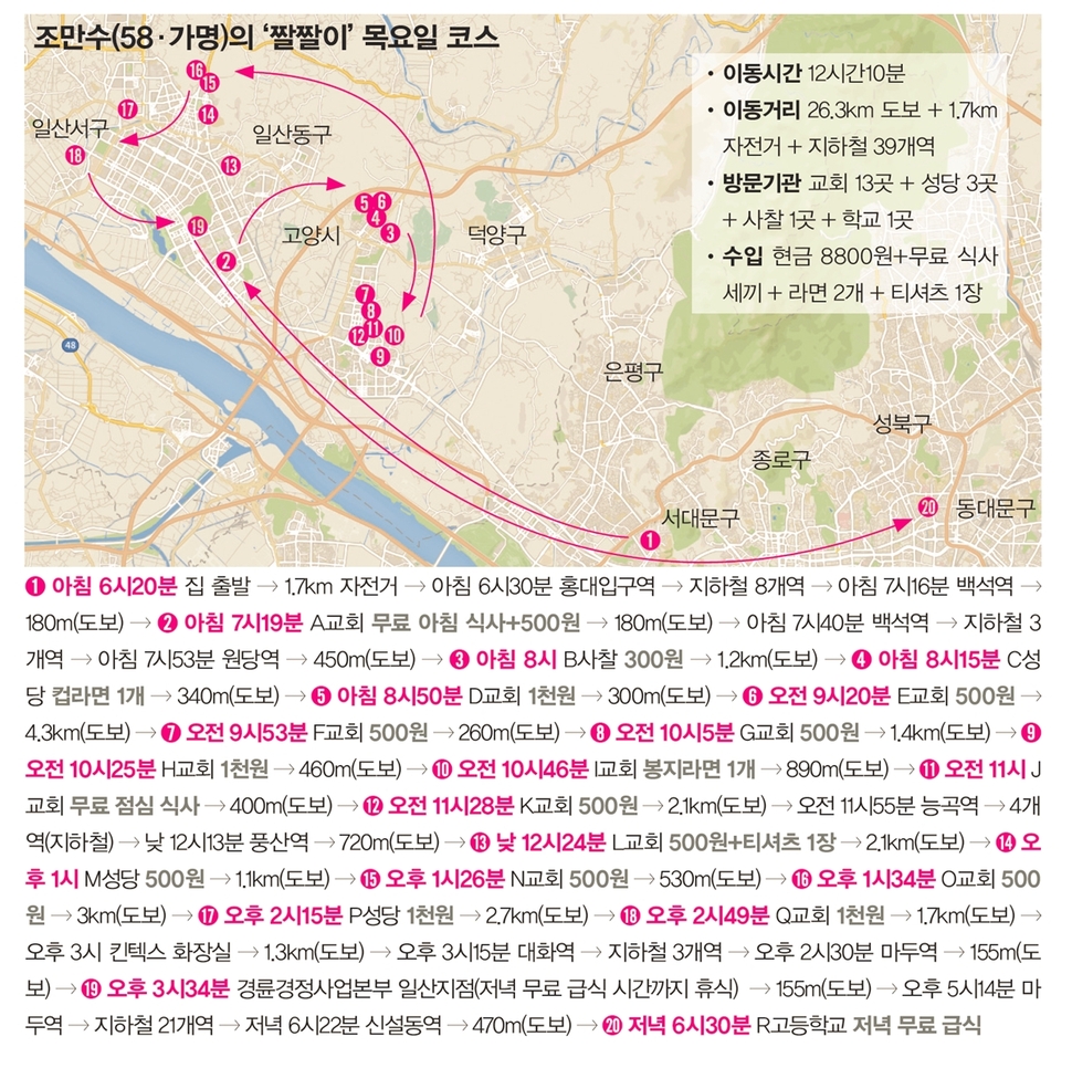 코스는 지역이 아니라 요일별로 짜였다. 구제비든 밥이든 매일 주지 않았다. 배고픈 자들은 수도권 전역을 뒤져 돈과 밥을 구할 곳을 요일별로 찾아 이어붙였다. 조만수는 북쪽으로 대화(고양시 일산서구), 동쪽으로 신설동(서울시 동대문구), 남쪽으로는 모란(경기도 성남시 중원구)이나 신갈(경기도 용인시 기흥구)까지 코스를 바꿔 오갔다.